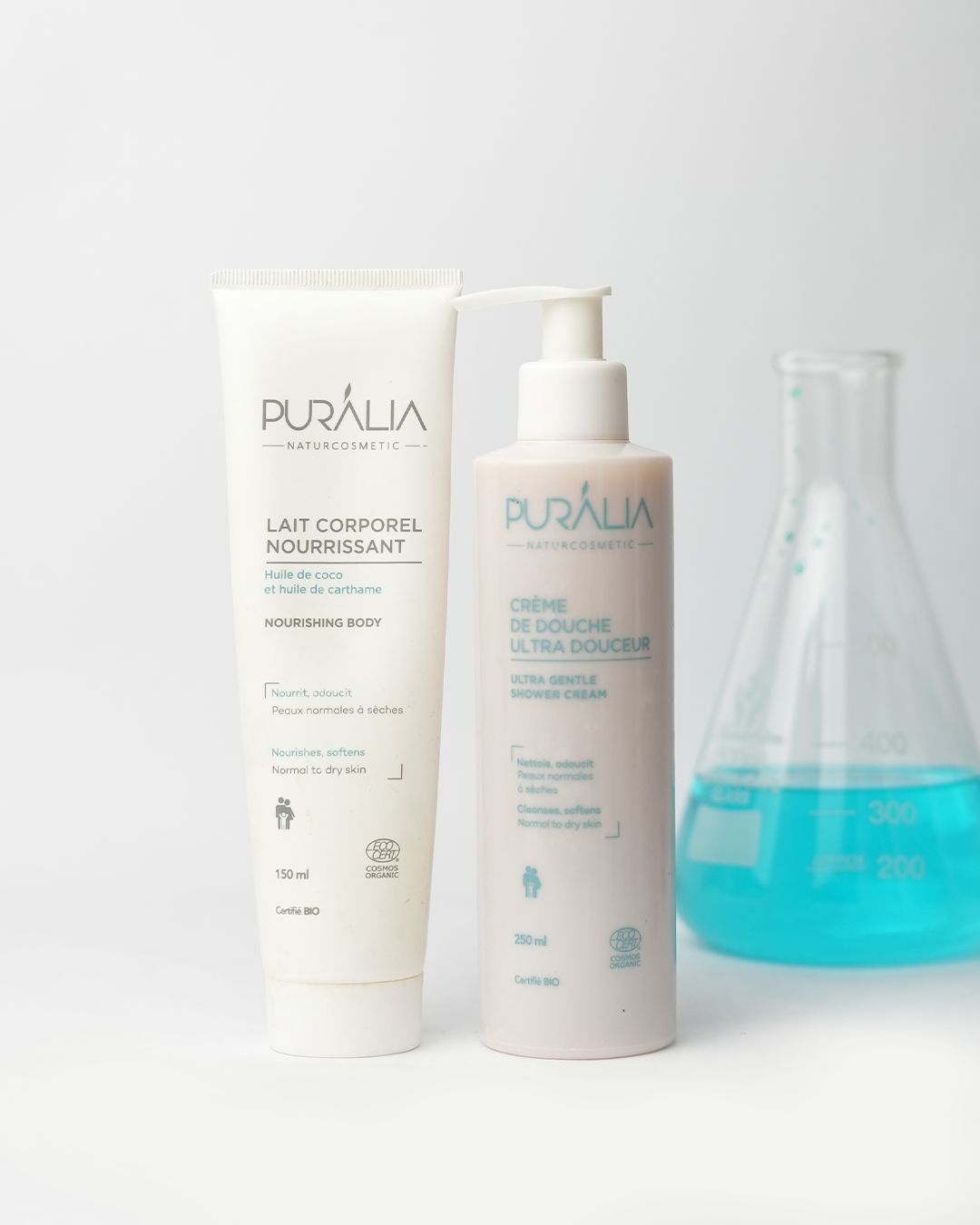 – Lait corporel nourrissant : Formulé à l’huile de coco nourrissante et l’huile de carthame émolliente, le Lait corporel nourrissant PURALIA est un soin à la texture ultra-fluide idéal pour les peaux normales à sèches des grands et des petits. Il pénètre rapidement sans laisser de film gras, tout en déposant un voile de douceur et de fraicheur sur la peau.