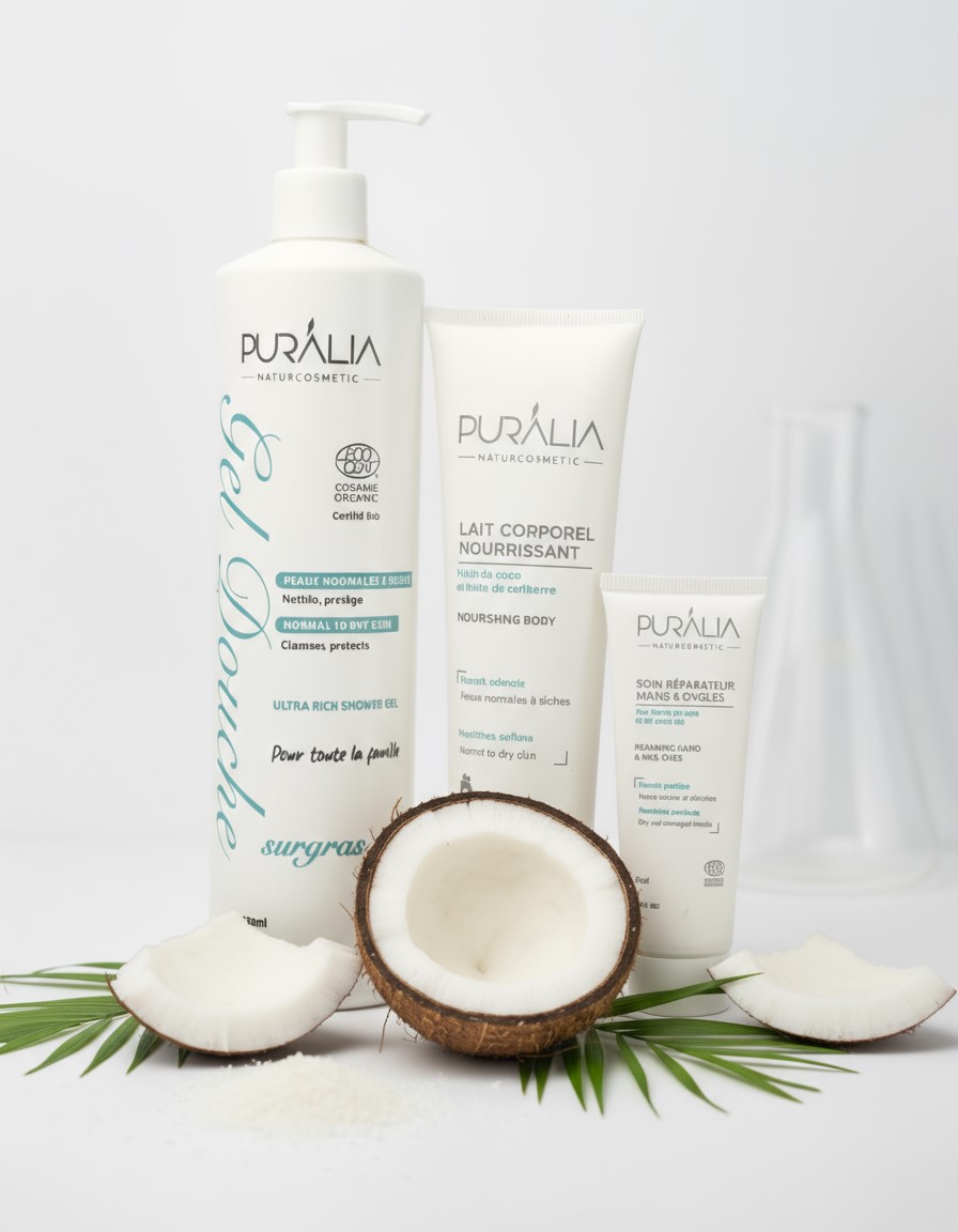 – Lait de corps Nourissant: Formulé à l’huile de coco nourrissante et l’huile de carthame émolliente, le Lait corporel nourrissant PURALIA est un soin à la texture ultra-fluide idéal pour les peaux normales à sèches des grands et des petits. Il pénètre rapidement sans laisser de film gras, tout en déposant un voile de douceur et de fraicheur sur la peau.